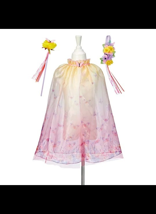 Pelerina Fluture cu accesorii Setul Pelerina Fluture Souza! include 3 piese: pelerină, bentiță și baghetă magică, toate în același registru floral și de fluturi. Pelerina este confecționată din 100% poliester ușor, cu un degradeu galben-roz și imprimeu cu fluturi în nuanțe pastelate. La gât, o garnitură decorativă cu flori de mătase galbene și roz, fluturași texturați și detalii cu strasuri. Bentița asortată are flori multicolore, un fluture și ștrasuri montate pe o bandă elastică strălucitoare. Bagheta, cu aceeași cromatică, completează transformarea în zână. Setul este disponibil în două mărimi. Caracteristici: Conținut: pelerină + bentiță florală + baghetă magică Material: 100% poliester Design: degradeu galben-roz, imprimeu fluturi pastel, garnitură florală la gât Mărimi disponibile: 3-4 ani (62 cm) / 5-7 ani (72 cm) Întreținere: spălare manuală Articol vestimentar Lungimea este măsurată de la gât până la baza pelerinei. Vârsta recomandată: 3-9 ani Producator Souza!