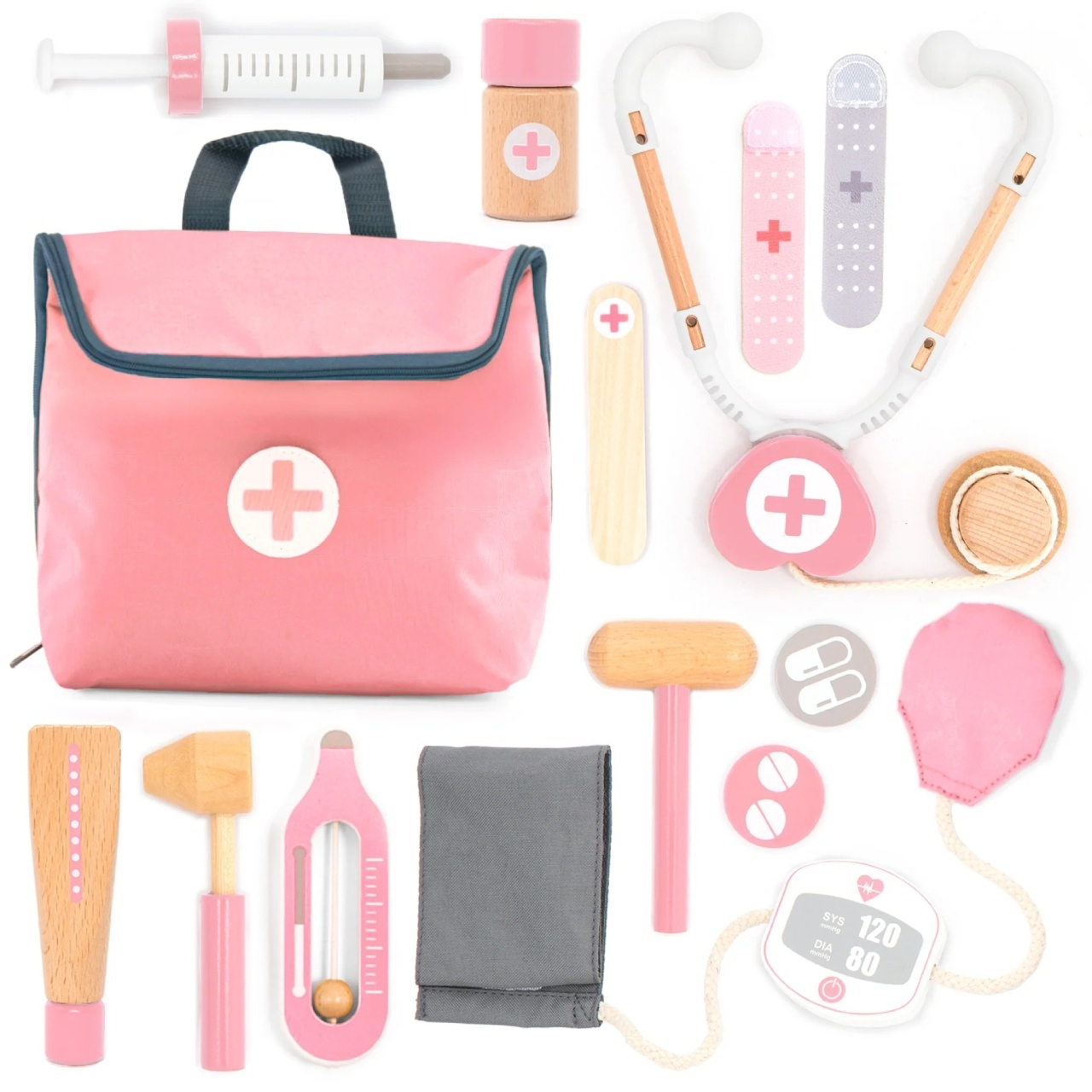 Joc de rol Mini trusa de doctor roz Trusa medicală mini UMU®, pentru copiii curioși să experimenteze meseria de doctor. Cu 14 accesorii din lemn masiv, acest set de joc de rol transformă spațiul de joacă într-un cabinet medical, unde cel mic poate măsura tensiunea, lua temperatura și îngriji răniți — exact ca un doctor adevărat. Spre deosebire de alte jucării similare, accesoriile UMU® sunt funcționale: manșeta de tensiometru se aplică cu adevărat, termometrul poate fi „folosit", iar bandajele pot fi puse pe răni imaginare. Totul este conceput să simuleze o consultație reală, ajutând copilul să înțeleagă vizita la medic și să o privească fără frică. Conține 14 piese din lemn în gentuță pentru depozitarea și transportarea echipamentului medical. Vârsta recomandată: +3 ani. Confecționat din lemn cu vopsele ecologice pe bază de apă, textil, plastic. Conform EN71&ASTM cu certificare CE.AVERTISMENT: Contraindicat copiilor sub 3 ani! Se recomandă supravegherea copilului de către un adult în timpul jocului.Produs în China pentru UMU Toys, Cehia.