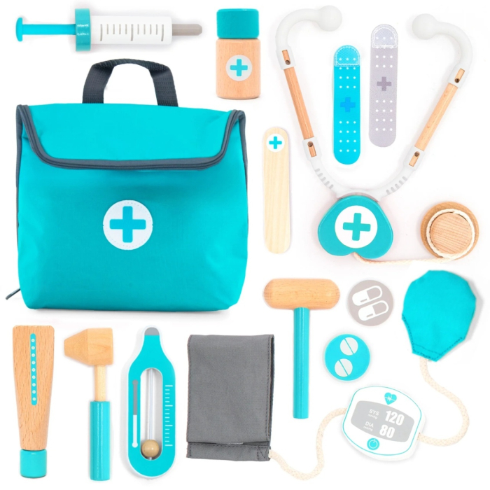 Joc de rol Mini trusa de doctor turcoaz Știi cum e când cel mic vine acasă de la medic și a doua zi vrea să fie el doctorul? Trusa medicală mini UMU® este exact ce are nevoie — un set cu 14 instrumente din lemn cu care poate deschide propriul cabinet. Stetoscopul se pune la urechi, manșeta tensiometrului se înfășoară pe brăț, seringa are piston care se mișcă. Nu sunt simple figurine colorate — sunt instrumente cu care copilul chiar face ceva. Și tocmai asta contează: când imită ce a văzut la cabinet, înțelege, procesează și data viitoare se duce la medic fără lacrimi. Conține 14 piese din lemn în gentuță pentru depozitarea și transportarea echipamentului medical. Vârsta recomandată: +3 ani. Confecționat din lemn cu vopsele ecologice pe bază de apă, textil, plastic. Conform EN71&ASTM cu certificare CE.AVERTISMENT: Contraindicat copiilor sub 3 ani! Se recomandă supravegherea copilului de către un adult în timpul jocului.Produs în China pentru UMU Toys, Cehia.