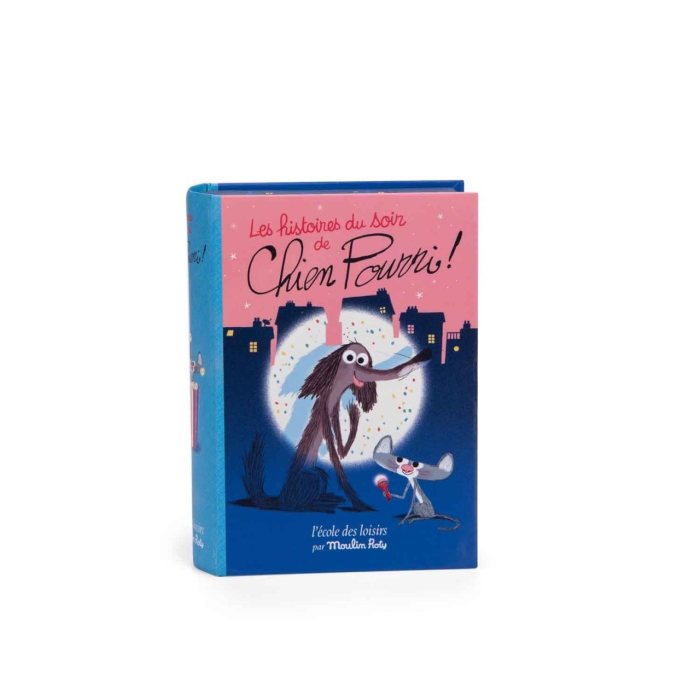 Cutie cu lanterna de proiectat povesti Chien Pourri Poveștile îl urmăresc pe personajul Chien Pourri în peripețiile sale pline de umor și căldură. Cutie magnetică, concepută ca o carte, care conține o lanternă de proiecție cu 5 discuri cu povești diferite și 5 invitații prețioase la spectacole, sub formă unor cărți poștale. Pentru seri de poveste sau pentru joaca creativă în familie. Introduceți discul ales în fanta lămpii, apasați butonul de pornire, focalizați și proiectați imaginea pe perete sau tavan, apoi rotiți discul pentru a proiecta următoarele imagini. Lampa proiectează imagini pe o distanță de până la 90 cm. Funcționează cu 3 baterii incluse (1,5 V AG13/LR44). Vârsta recomandată: +3 ani. Material: plastic ABS. Se curăță cu o cârpă moale și umedă. Producător Moulin Roty, Franța.